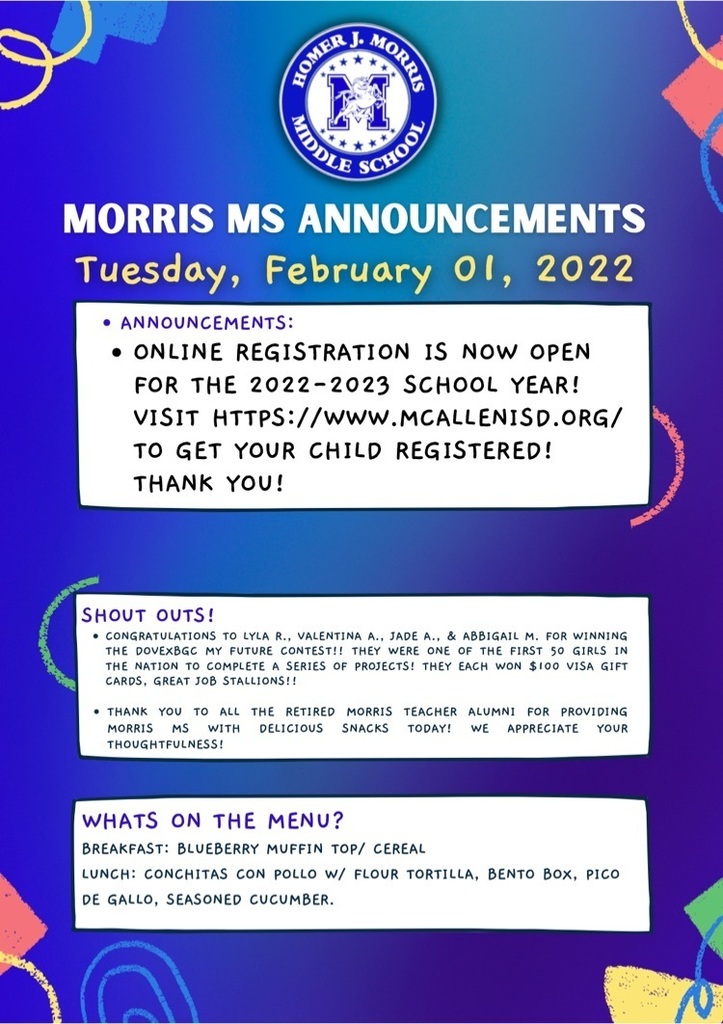 Good morning Morris community! ☀️Check out what’s on the morning announcements for Tuesday, February 8, 2022!🎉🙌👍